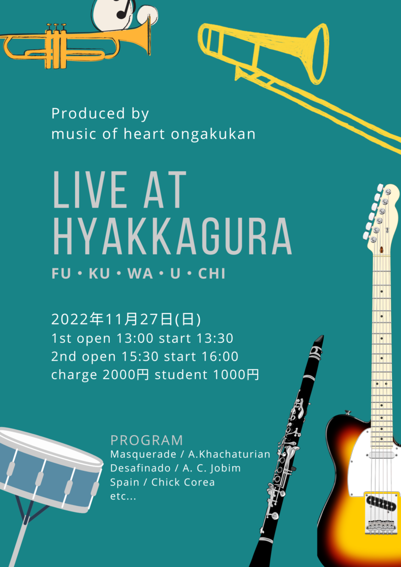FU・KU・WA・U・CHIメンバー(クラリネット,トランペット,ドラム)に、ゲストとしてバストロンボーン、ギターを迎えての、珍しい編成。 長い間、那珂湊の地で生き続けた大谷石の蔵。 地域遺産である石蔵『百華蔵』での響きをお楽しみ下さい。 【ミュージック...