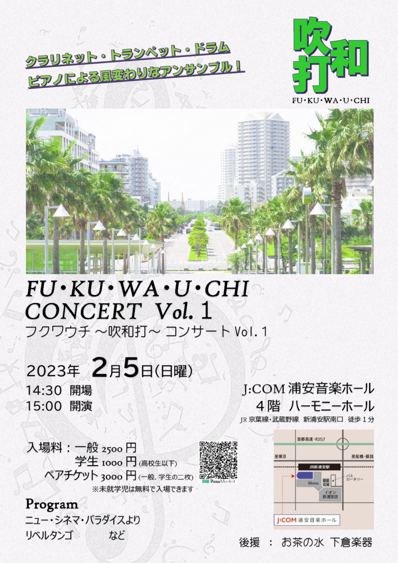 フクワウチ~吹和打~コンサート Vol.1 ◇日時 ・ 2 0 2 3 年 2 月 5 日 (日) ・14:30開場~ ・15:00開演~ ◇場所 ・J:COM 浦安音楽ホール(4階ハーモニーホール) 〒279-0012 千葉県浦安市入船一丁目6番1号 ・交通アクセス. JR京葉線・武蔵野線 新浦安...